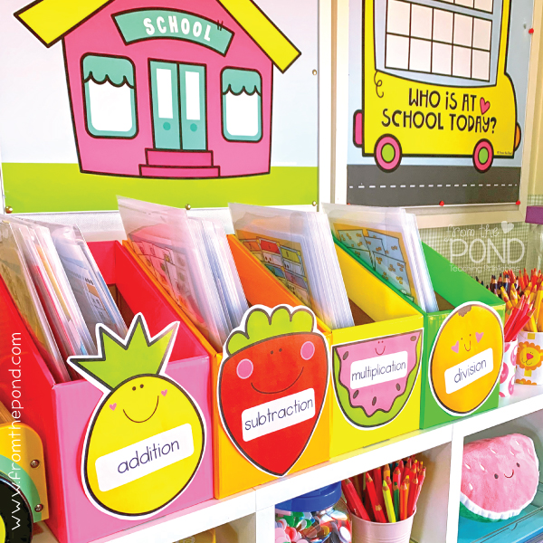 Use our printable classroom labels to help orgninize your resources for math! We have used bright, happy labels from our fruit collection to sort math center packs into addition, subtraction, multiplcation and division.