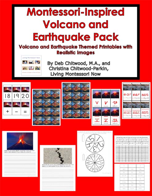 You’ll find Montessori-inspired volcano and earthquake numbers, letters, and and more (part of my subscriber freebie pack, so just sign up for my email to get the link and password … or check the bottom of your latest newsletter if you’re already a subscriber)