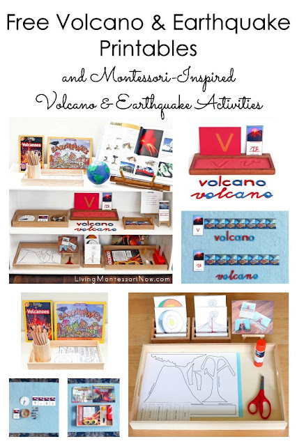Go to my Free Volcano & Earthquake Printables and Montessori-Inspired Volcano & Earthquake Activities post at Living Montessori Now for the free printables and activity ideas you see on the shelf and collage above! Free Montessori-Inspired Volcano and Earthquake Pack
