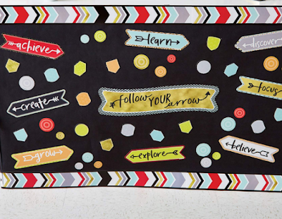 Arrows everywhere! Arrow fonts on arrow cut-outs, and even the border is made of arrows. I love these positive words used: focus, discover, believe, explore, learn, achieve, create, and grow.