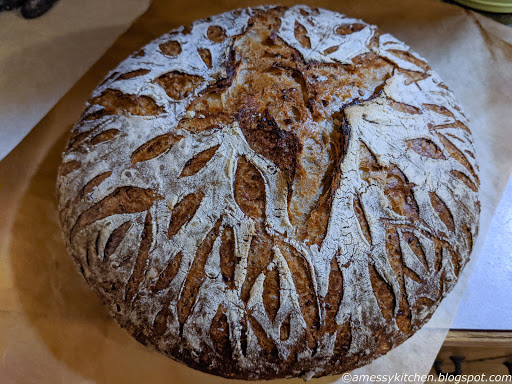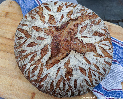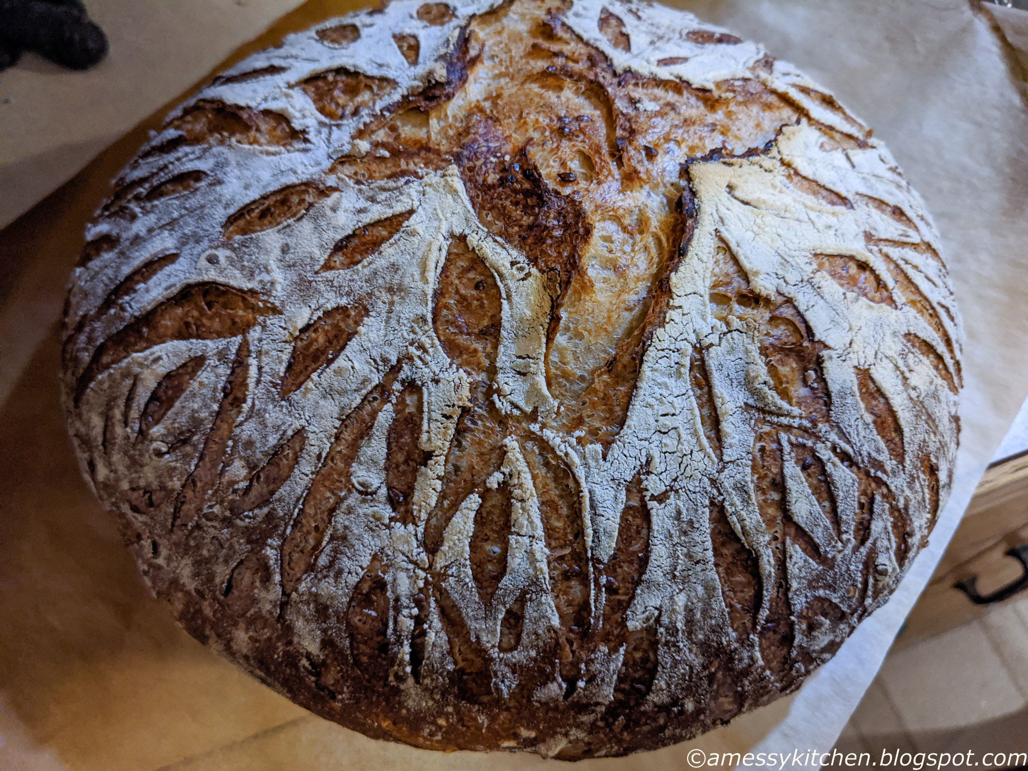 This month, our Bread Baking Bakes is being flexible with the recipe you choose because the point of our challenge this time was to try out some decorative scoring with our loaves! It's not as difficult as it looks, but perhaps more difficult than you might think. For my next attempt I will do more planning on the pattern, and change the handle on my lame. That, or just hold the blade with my fingers. I got a brand new lame, but the giant nut that holds the blade on kept on marring my dough because there was only about ¼" of exposed blade. I would prefer at least twice that. So we will try again! My hydration was probably a few percentage points lower this time than the last time I made this loaf, which is why I think I had a little tearing on the top score. I don't mind how it looks though, and that's a matter of personal preference.
