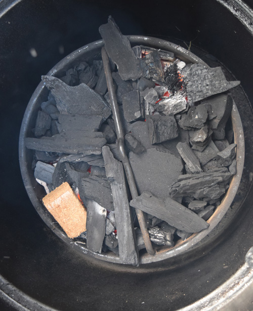 For the sear part, I raised the fire bowl to the upper position. It sits on the inverted heat shield, so it's in the right spot for grilling.