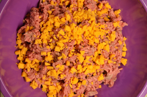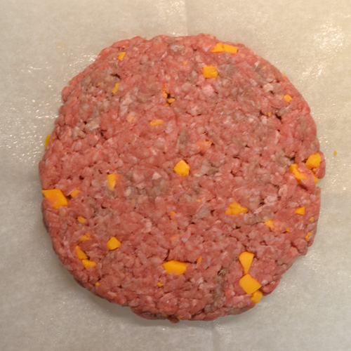 Make the burger patties. Break up the ground chuck and mix in the shredded cheese so that it is evenly distributed. Form into four 8-ounce patties and keep refrigerated until ready to grill.
