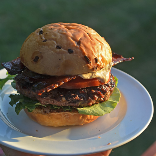 This burger that we made for dinner last night was amazing. It boasted a big half-pound beef patty laced with mild cheddar, topped with candied bacon, sliced fresh Grainger County tomato, greenery, and a ridiculously good brisket jus mayo.