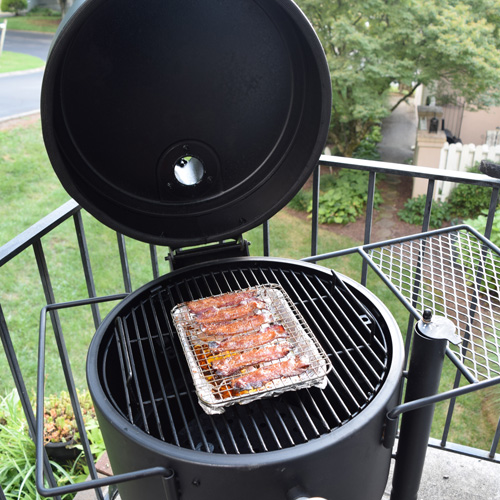 Because I wanted indirect heat to start with, I had the fire bowl in the lower position, and a heat deflector went between this and the food, similar to a kamado grill. For a charcoal grill, just build a fire to one side and put the food on the empty side. For a gas grill, place the food over a burner that isn't turn on or is turned on low. The piece of wood is a compressed applewood chunk from Mojobricks. I wanted to give the candied bacon a good dose of smoke.