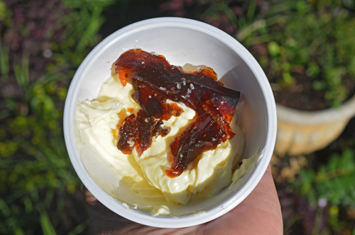 I used some of my home-cured and home-smoked Sorghum and Bourbon Bacon for the candied bacon.