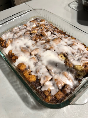 Remove casserole from oven. Warm icing from cinnamon rolls in microwave for 15 seconds, add powdered sugar and milk and mix well; pour evenly over bake.