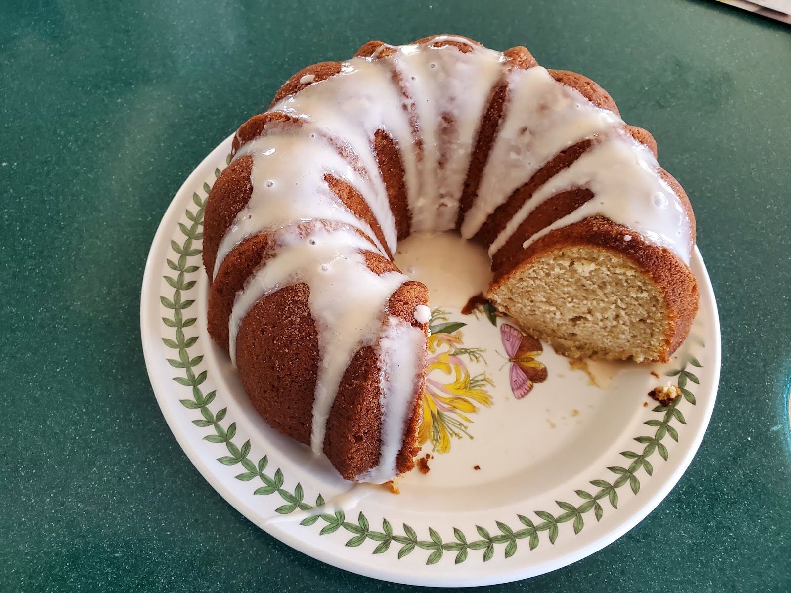 Although spring is upon us here in San Diego, I really do love a cup of spiced hot cider any time of the year. The other day while trolling the internet, I found a recipe for Apple Cider Doughnut Cake---who could resist? The original recipe had you basically making apple sauce, so I tweaked it a bit, and then I made a glaze for it, since the best donuts have a glaze, and voila! I'm continuing my adventures in sourdough, and just pulled two lovely loaves out of the oven. I'm sold, and so is Dr. C. More on that in another blog post. For now, enjoy this cake.