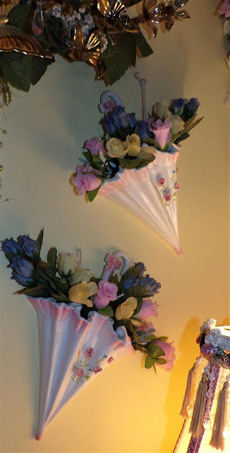 Hanging on the wall to the side of the mirror are 2 vintage ceramic umbrella planters bought at the same church Flea Market........