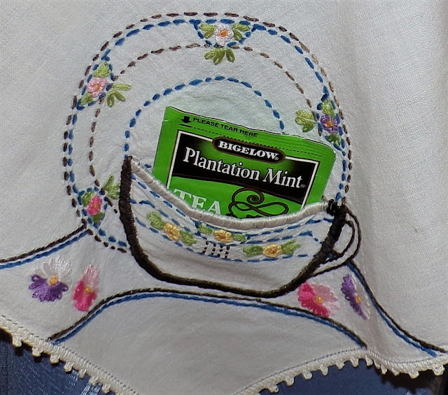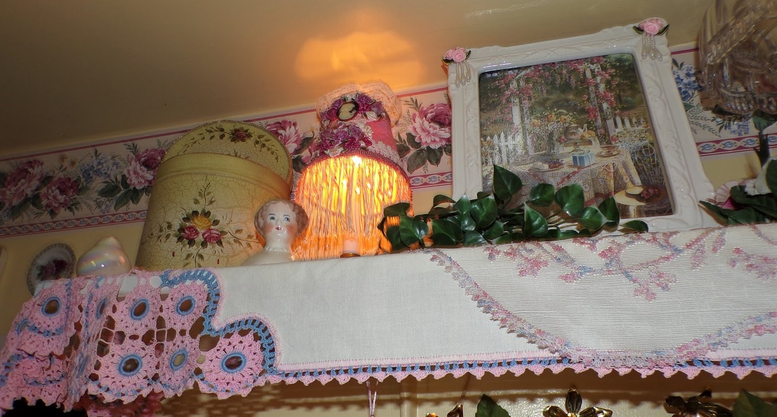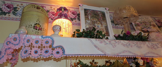 The vintage linens on this shelf , except for the one in the middle were made by my Maternal Grandmother......