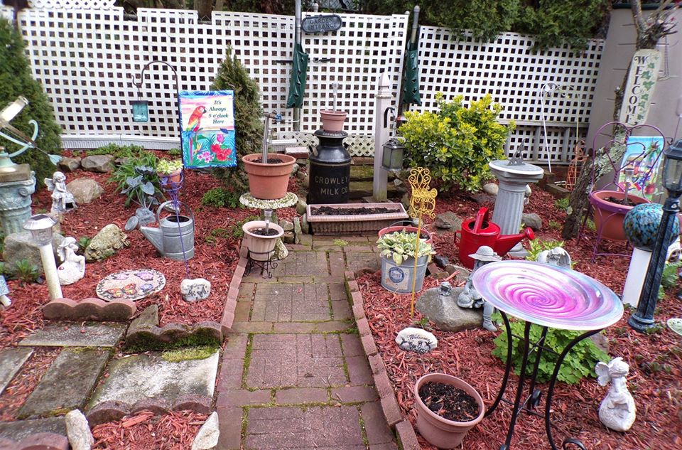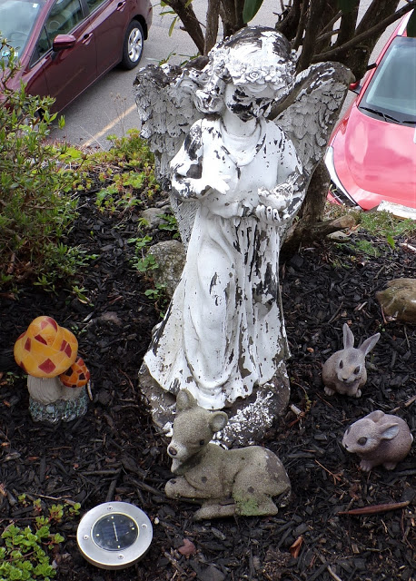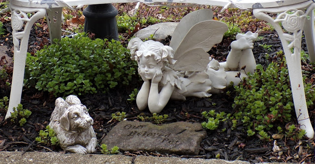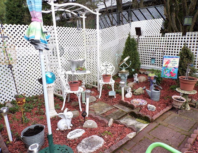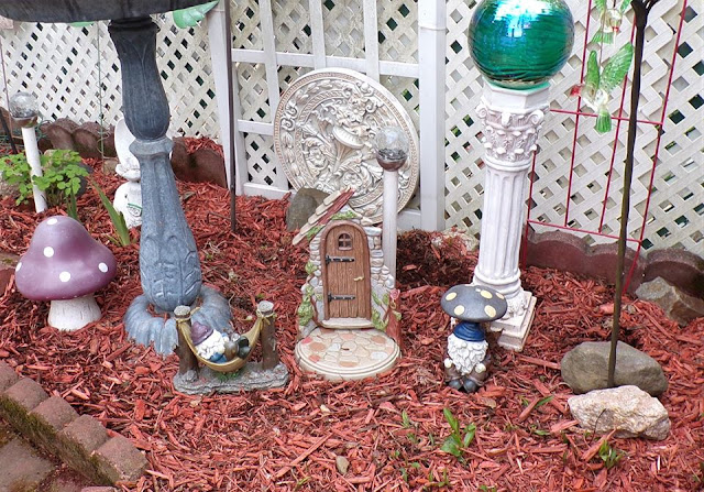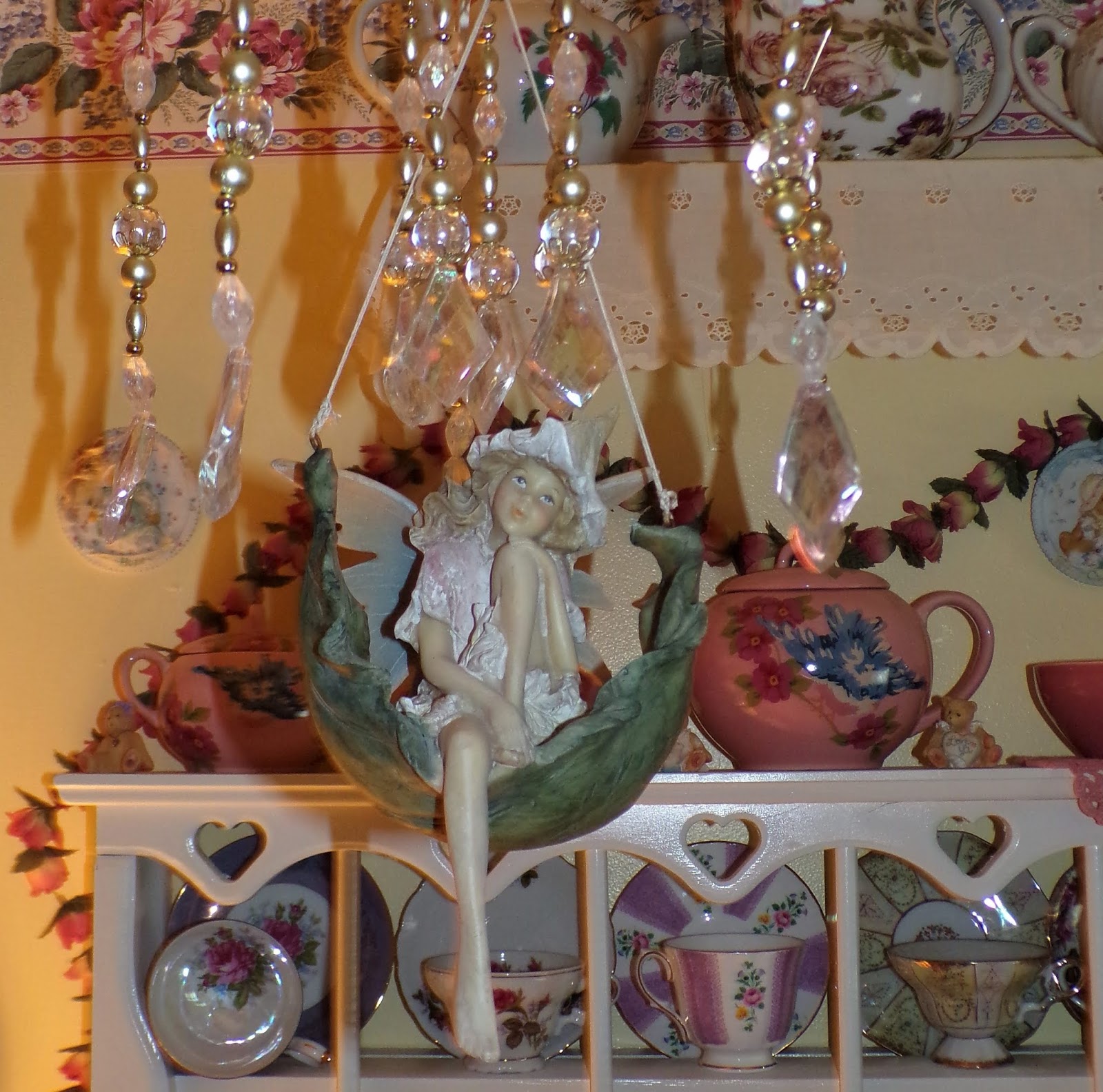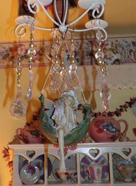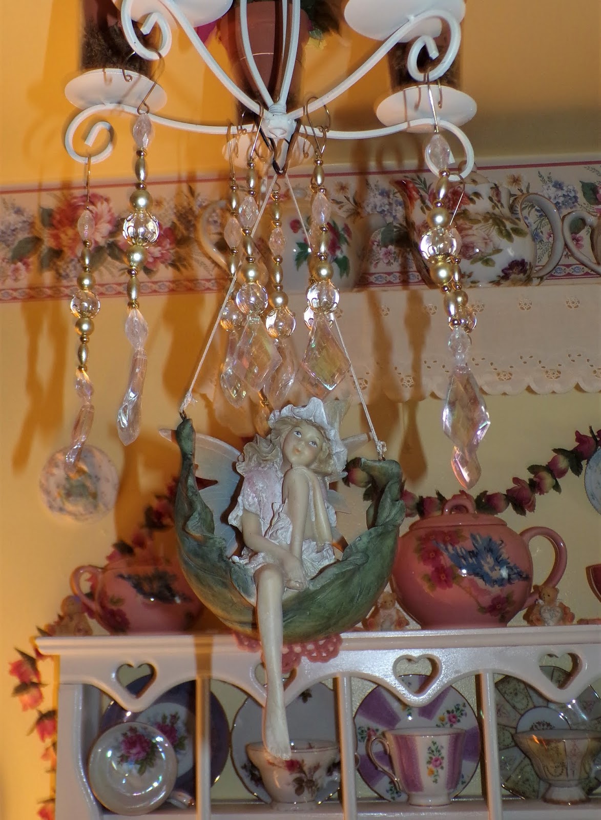 I hung chandy crystals bought at Wegman's after Christmas on Clearance along with a Garden Fairy from the chandy.....