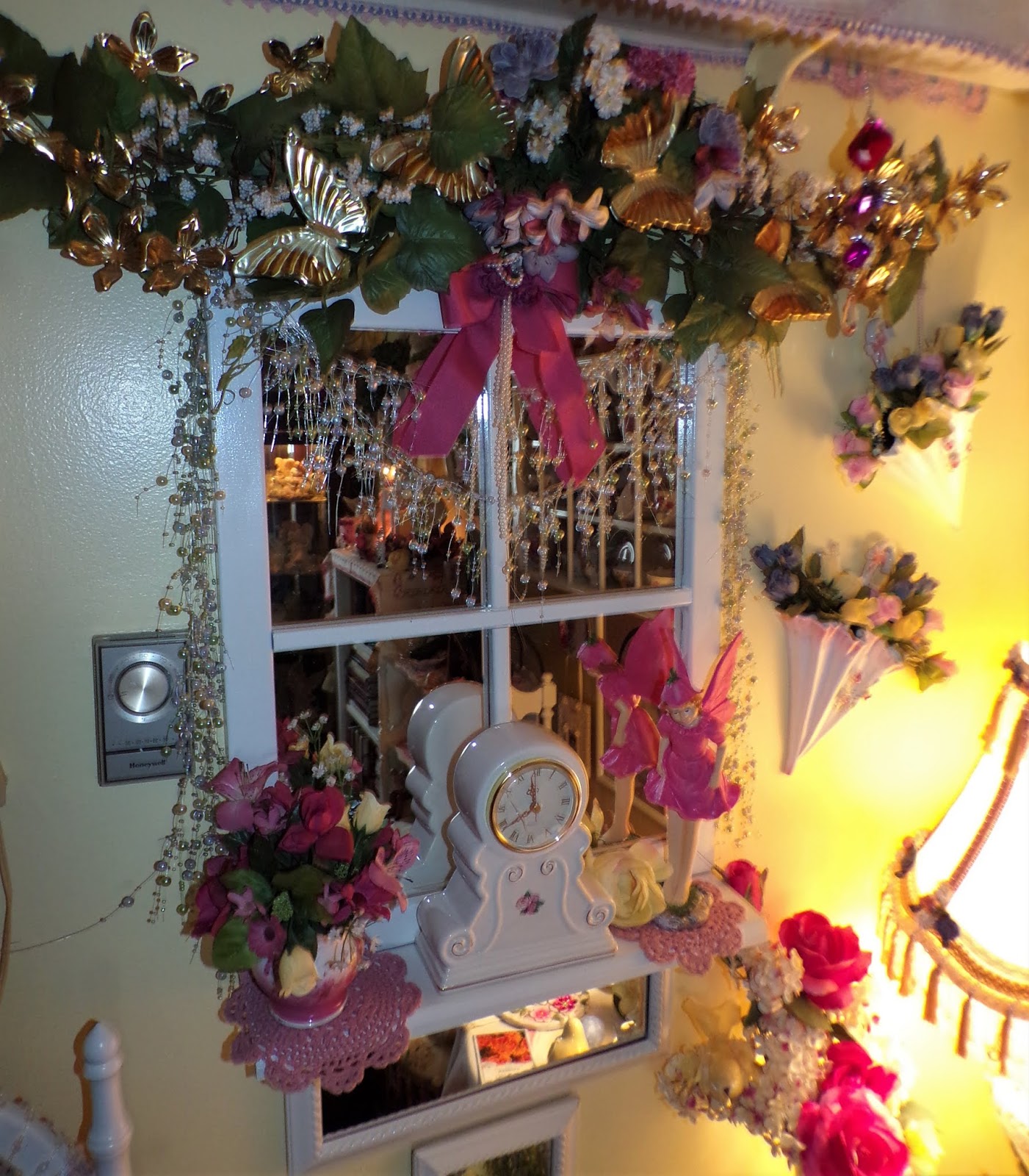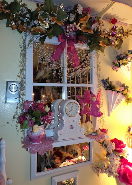 Under the shelf is a window pane mirror that I bought at a Flea Market......