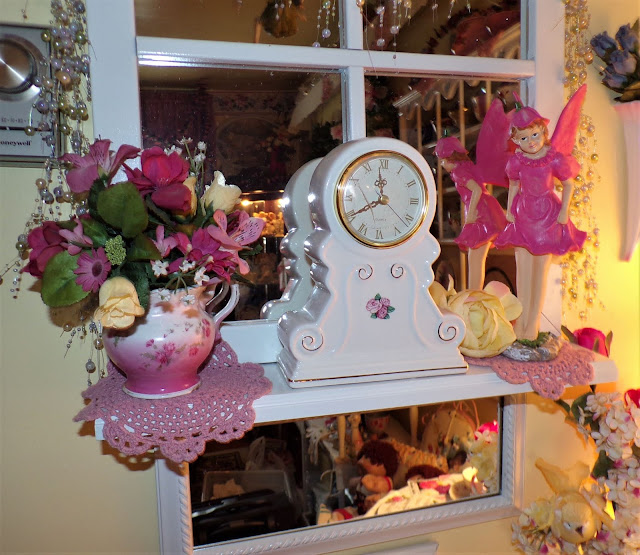 On the shelf is the matching shaving cup to the 4 piece Bowl and Pitcher set , a clock and a sweet pink fairy that I bought 3 years ago in Dollar General......
