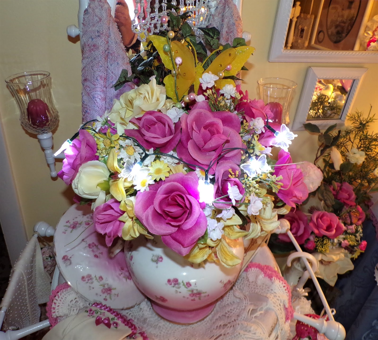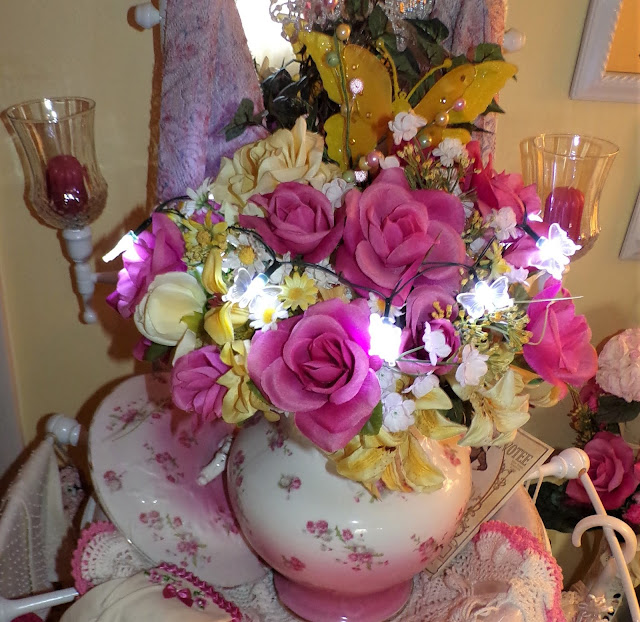 A bright yellow Butterfly ornament sets in the back of the arrangement and a set of battery operated Butterfly lights bought at Dollar Tree lights it all up