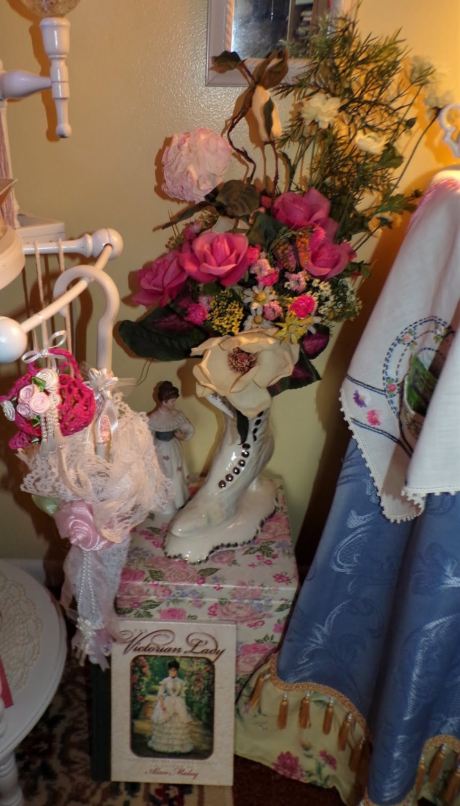 A vintage Victorian ceramic boot that I bought in Salvation Army sets on top of a vintage sewing basket that I have used to store Christmas decorating magazines inside.....