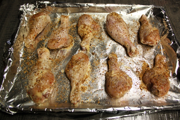 - Line a rimmed baking sheet with foil or parchment paper. Spray with non stick spray. Place the chicken legs onto the baking sheet.