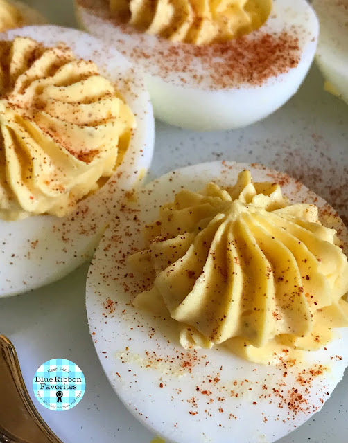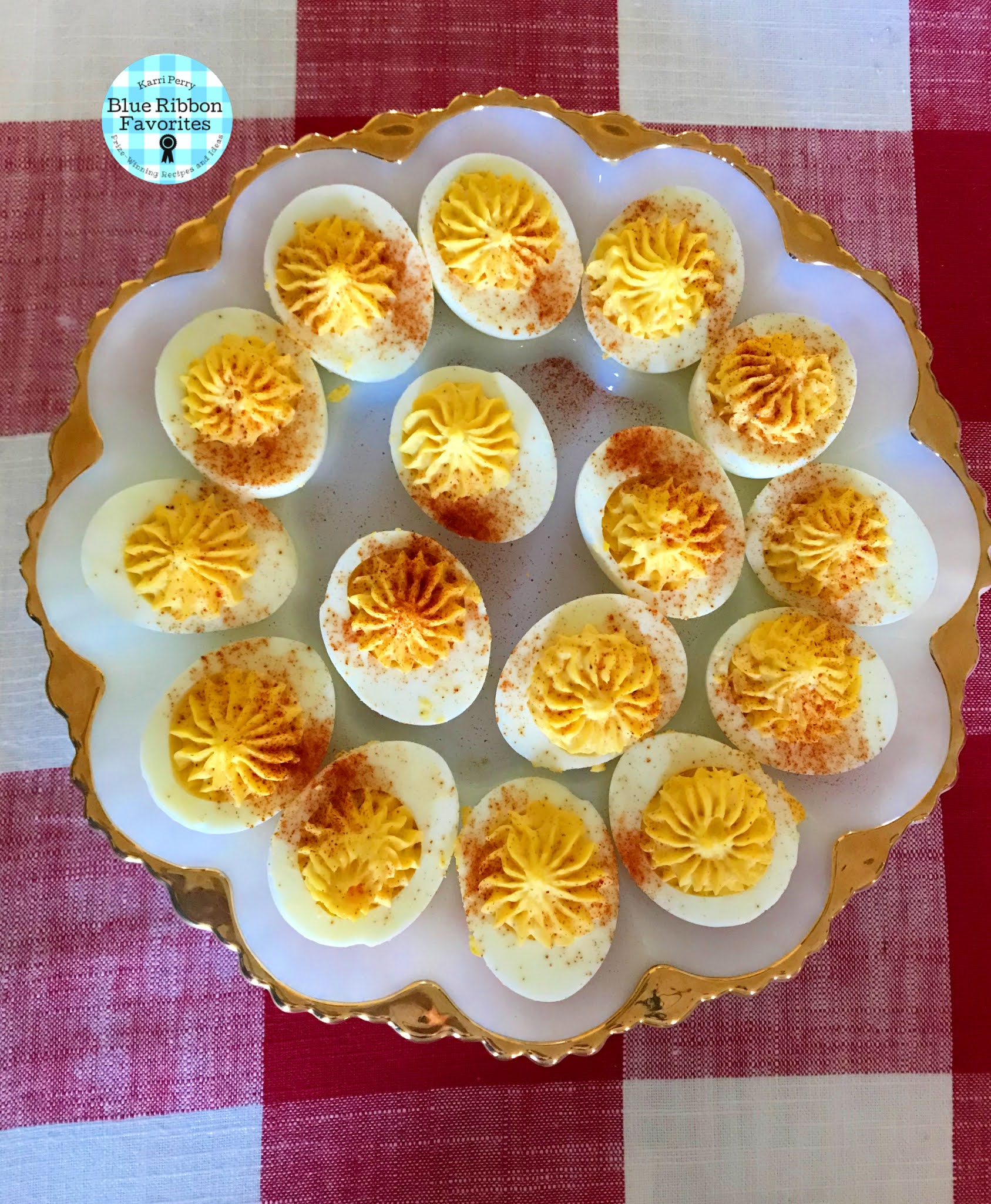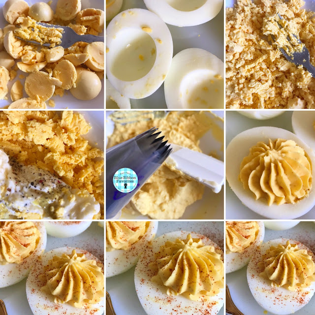 Scoop the yolk mixture into a piping bag fitted with a large tip if you’re feeling fancy or simply spoon in the yolk mixture filling into each waiting hard boiled egg white.