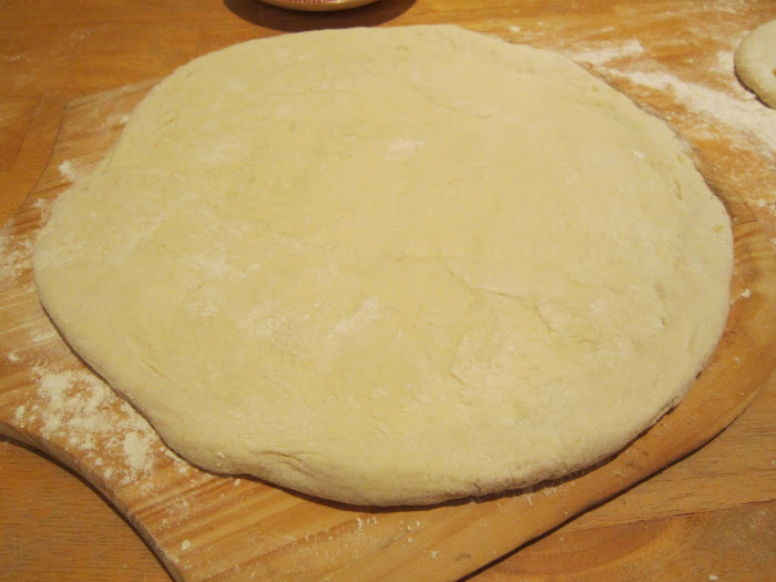 Give yourself about 2 feet of width on the counter top. Generously flour the work surface. Position your peel next to the floured area and dust it with flour. (If you don't have a pizza peel, a flat metal baking sheet also works well.) Have the sauce, cheese, basil, and pepperoni prepared and at hand, with a ladle or large spoon in the sauce.