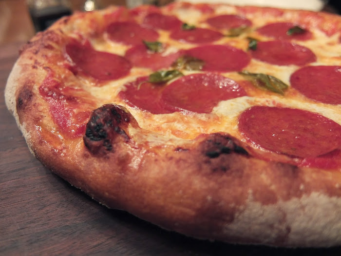 Now that I've shared Ken Forkish's recipe for Same-Day Straight Pizza Dough from Flour Water Salt Yeast, it's time to make his version of a classic New York pizza, which he calls "The New Yorker"! This fabulous pizza is topped with red sauce (I use my easyHomemade Marinara), grated fresh mozzarella and provolone cheese (which I request an un-sliced chunk of from my local deli), pepperoni, and finished with fresh basil and chile flakes. Delicious! As Ken notes in his book, because this is baked in a home kitchen, the pizza will only be about 12 inches diameter. He suggests compensating for the lack of size by cutting the pizza into no more than four pieces. This allows you to fold it, if you want to be authentic!