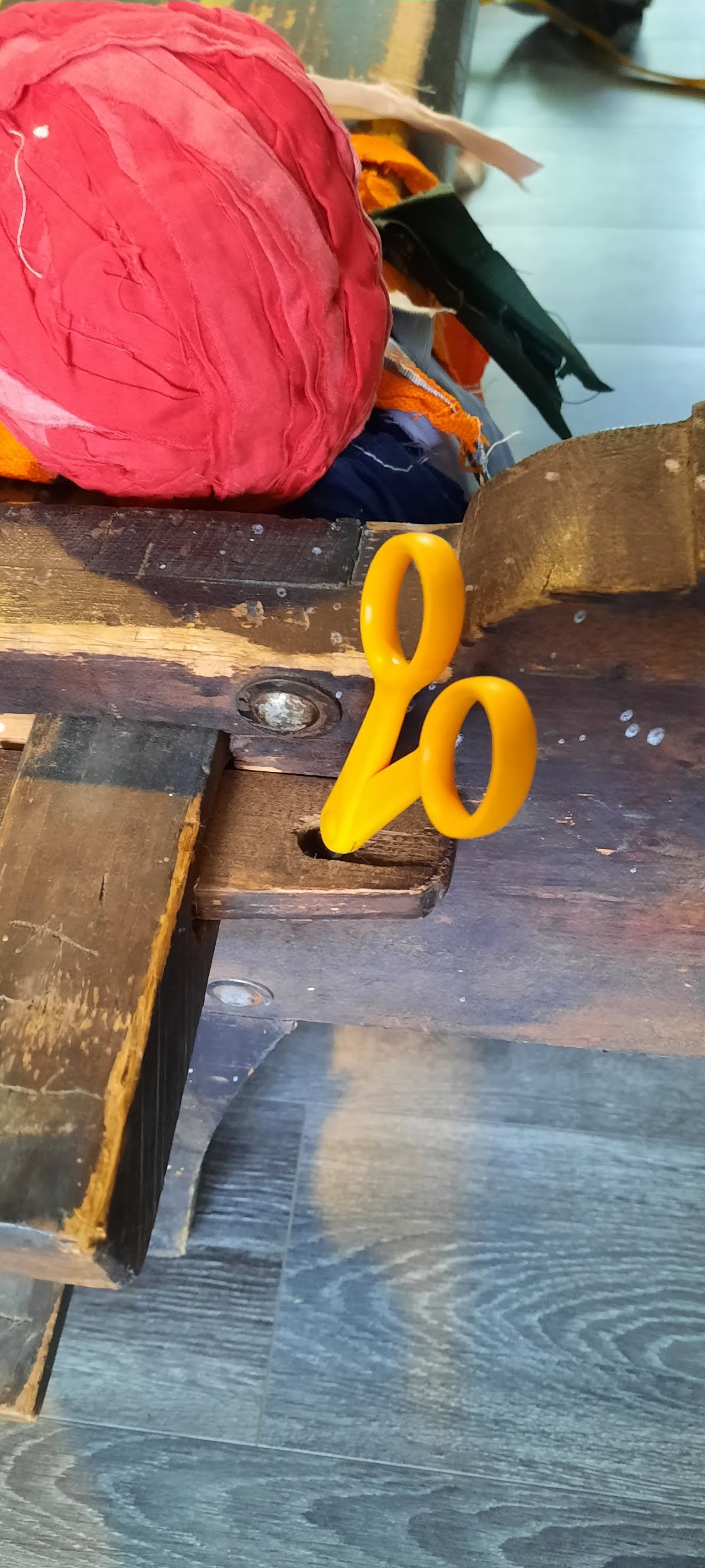 Now here's one little nifty thing that I discovered, that I don't even need to improve! While I was weaving the last rug on the loom, I realized my little scissors needed a resting spot. Usually I just glue a magnet somewhere onto the loom to hold the scissors by the tip. But on this loom I discovered a nice little hole on the wedge used to hold the bench seat into place. Perfect for a scissors!